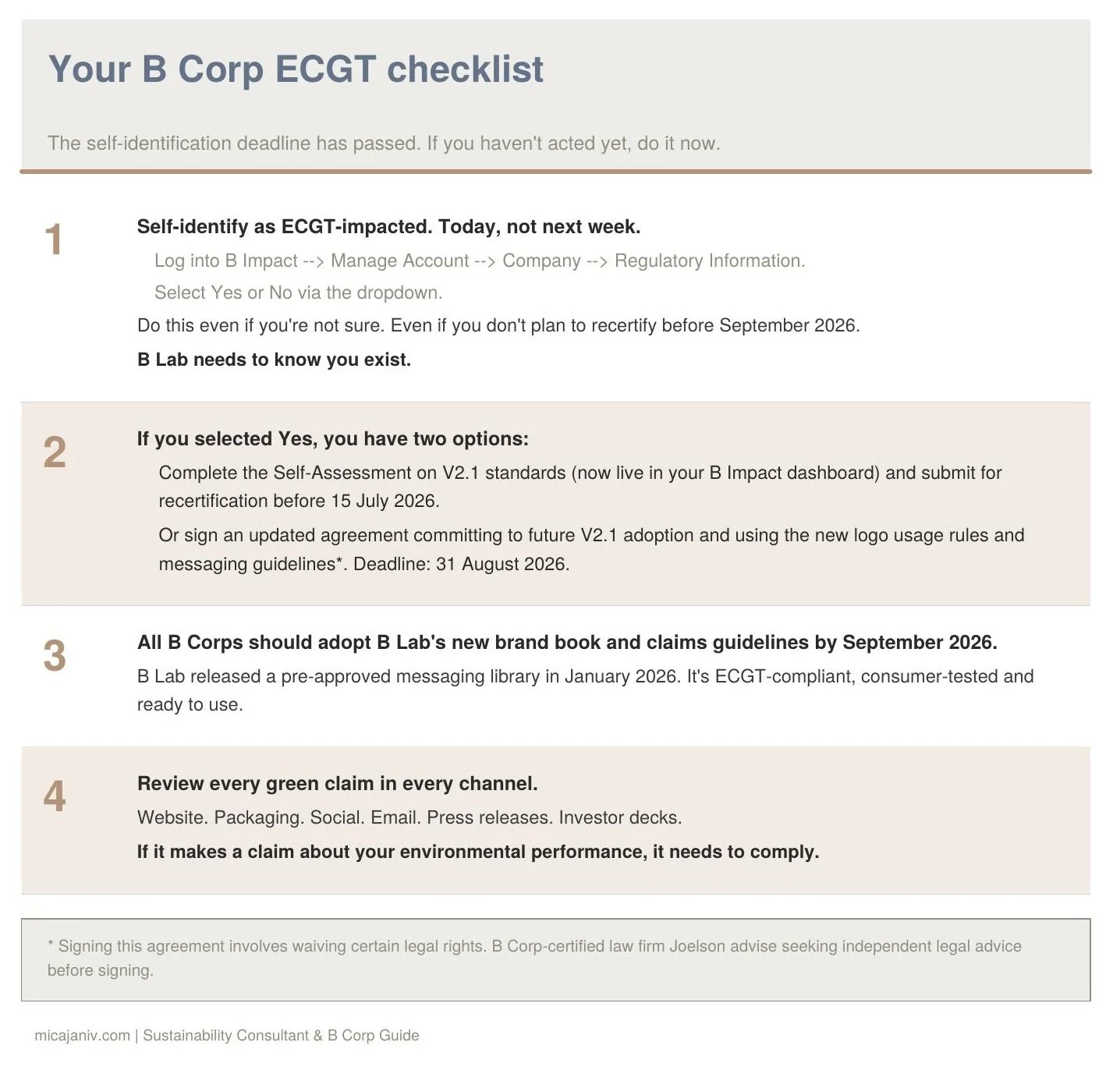 For B Corps, there's an extra layer. B Lab has confirmed that B Corp certification (V1.6) is not necessarily ECGT-compliant. B Lab UK have asked all UK B Corps to ‘self-identify’ if your business is affected by the ECGT.